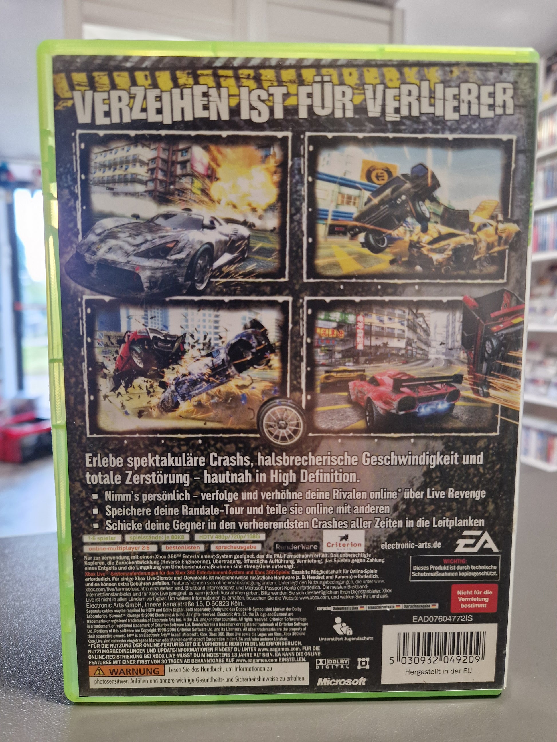 Erlebe temporeiche Rennen mit Burnout Revenge für Microsoft Xbox 360. Die Hülle ist in gutem Zustand, das Spiel läuft trotz einiger Kratzer auf der CD einwandfrei. Perfekt für Fans von actiongeladenem Rennspielspaß, die ein günstiges Angebot suchen.